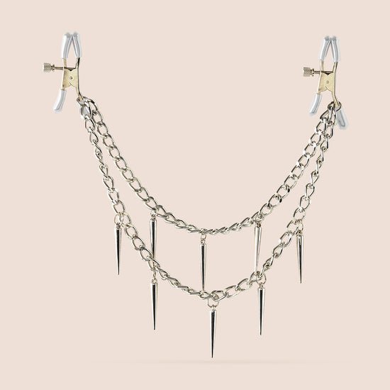 Make your nipples perk with pleasure with these Rock Hard Nipple Clamps. Made with durable metal clips and covered in soft rubber liners, these clamps are perfect for beginners and fetish enthusiasts alike. The amount of pressure you apply to the nipple is adjustable by turning the screw, while the two chains give you subtle stimulation with each movement.
