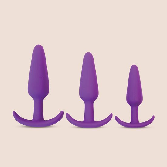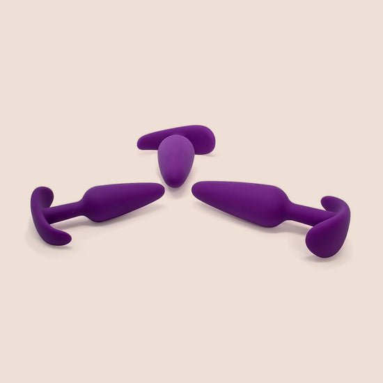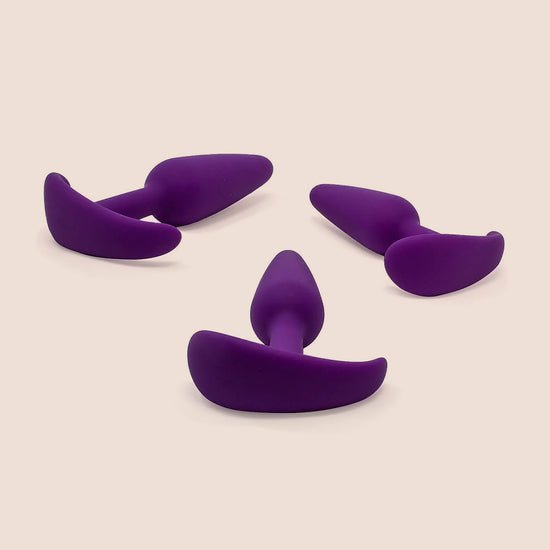 Gossip Rump Rockers Violet Purple Butt Plugs. 100% Pure Silicone! 3 piece anal plug trainer set. Graduated sizes for extra comfort. Curved, ergonomic base for easy wearing. Can be warmed or cooled for a variety of sensations. Ultra premium Silicone Silk feels like velvet on your skin.