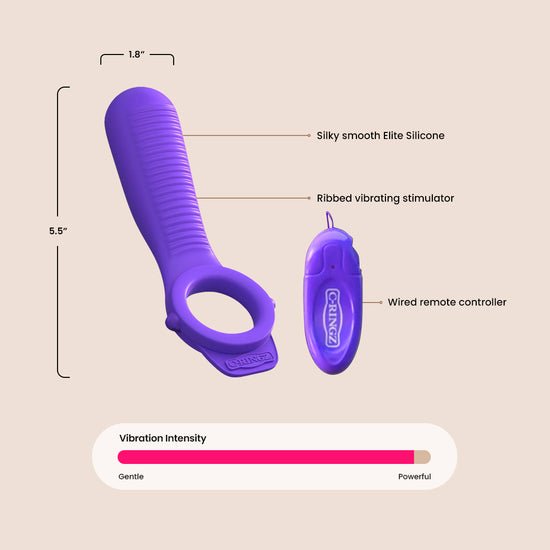 The wrap-around design of the silicone ring pushes his package out to the max and keeps the ring flush against his body, making him thicker and harder than ever before. He'll love the tight squeeze and improved performance from the stretchy ring, and you both will love the magical, super-powerful vibrations.