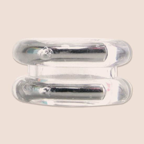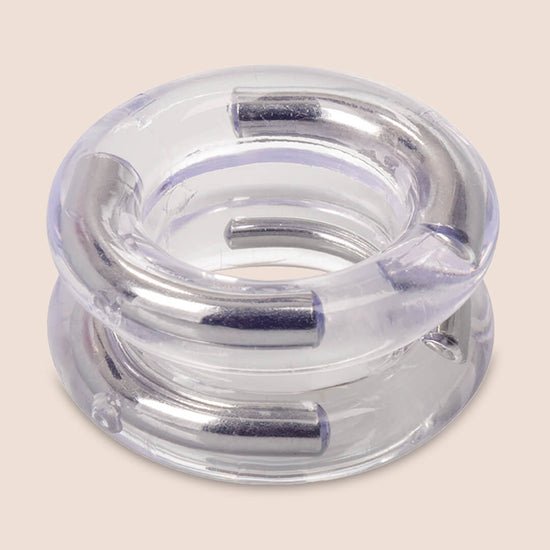 The Support Plus Double Stack Enhancer is stainless steal enforced on both sides. These four curved steel plates are encased within a soft and stretchy jelly ring. This means that the ring is firm enough to hold an erection but soft enough to feel comfortable during sex and flexible enough to easily slip on and off.