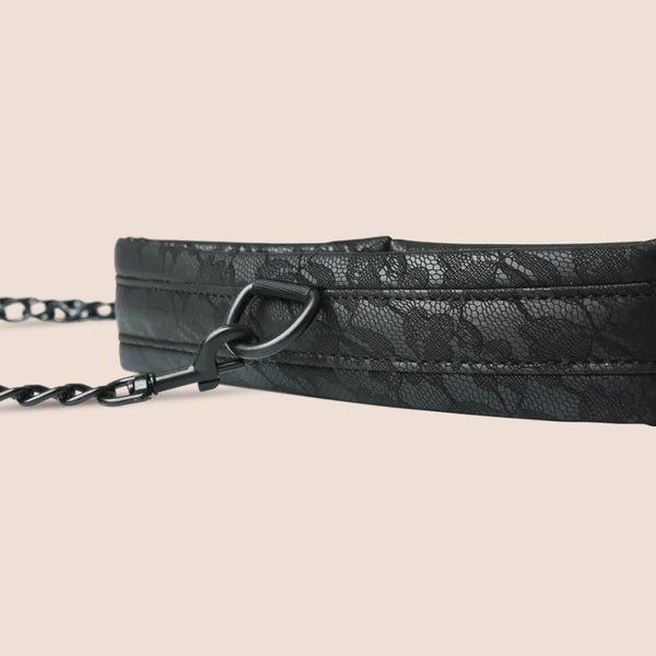 The comfortable padded collar, made of soft, inviting fabric of fine lace, fits perfectly around most any size neck. Linked leash serves as a constant reminder of who is running your fantasy.