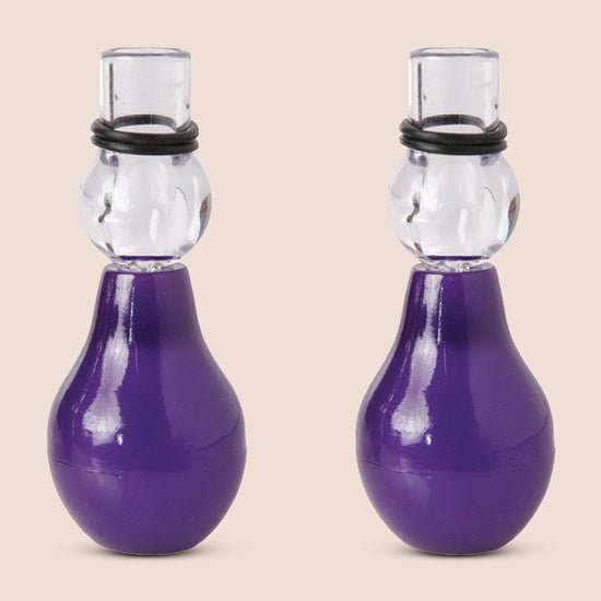 The Nipple Erector Set has everything you need to get your nipples pumping with pleasure! To begin, choose the pump with the smaller opening and place it over your nipple. Squeeze the pump to get to a desired perky state then slide the rubber ring around the nipple to keep it erect. Repeat the process on the other nipple. To make the nipples even larger, use the pump with the wider opening.