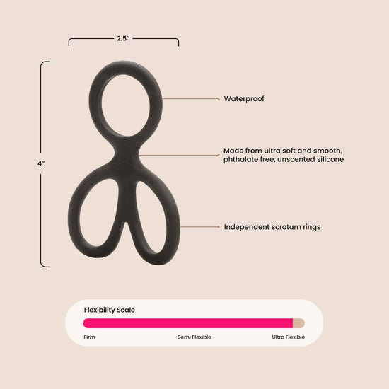 The lightweight ring is made from ultra soft and smooth, super stretchy phthalate free, unscented silicone, and measures a compact 4” x 2.5”/10.25 cm x 6.25 cm overall. The comfortable erection keeper features a stretchy c-ck ring and built-in independent scrotum rings for added stamina support. The erotic design enhances arousal and stimulation for you and your lover and is easy to fit and to remove after play.