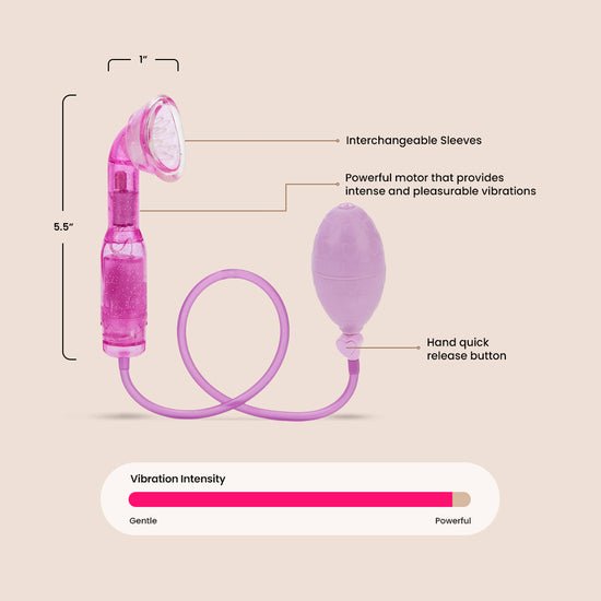 Just place the contoured opening over your clitoris, squeeze the cute heart-covered hand pump to provide gentle suction and amazing arousal, and add vibration for over-the-top sensations.