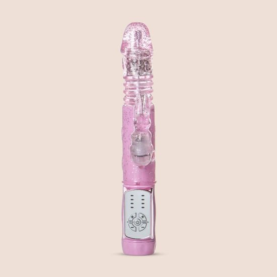 The glitter finish rabbit massager measures a compact 5" x 1.25"/12.75cm x 3.25cm and is made from smooth and soft TPR, and has an easy push button ABS controller with auto off switch. The power-packed thrusting massager has a flexible shaft with pleasure ridges, a smooth rounded tip, and a curvy bunny teaser, with flickering ears. Use it to massage, arouse and stimulate sweet pleasure spots all over the body.