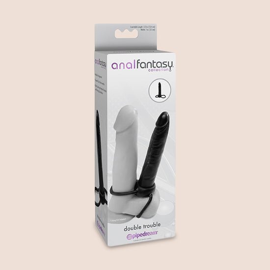 If you've never tried anal play, then Double Trouble is just what you need to explore the amazing world of anal stimulation. This Double Trouble strap-on allows you to experience the thrill of double penetration without involving another partner! The TPR ring on the top of the shaft acts as a performance-enhancing c ring, while the larger bottom ring loops around his balls for a super-tight squeeze.