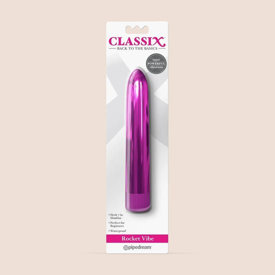 Blast off into orgasmic orbit with the Classix Rocket Vibe! This sleek 7-inch slimline features a brilliant metallic finish that shines like the stars and a powerful motor that will thrust you into ecstasy. The non-porous, body-safe vibe features an easy multi-speed dial to control the adventure! 3'¦ 2'¦ 1'¦ Lift off! Perfect for Beginners Sleek 7 in. Slimline Waterproof