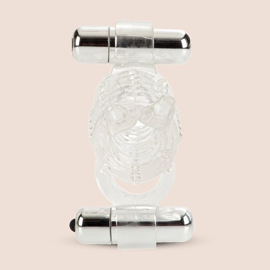At the far end of the sleeve, there's a little bullet vibe that's positioned perfectly for clit stimulation, while a second bullet placed underneath the testicle ring takes care his perineum and anal area.