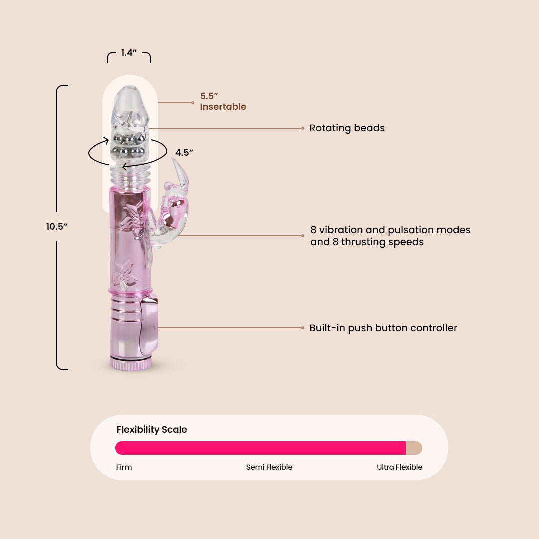 Powered by 2 sturdy motors, the Thrusting Bunny comes packed with 8 independent speeds of vibration, ensuring you the most orgasmic potential possible.