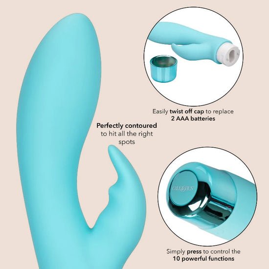 CalExotics Eden Bunny packs intense pleasure into a super soft, flexible female sex toy that will send you leaping over the edge of ecstasy. Transport yourself to a pleasure paradise with a combined G-spot massager and clitoris massager radiating with 10 intense vibration functions. The fluttering, external clit vibrator flexes with your every movement while the contoured body cozies up comfortably to you, making this waterproof vibrator an adult toy box essential for every pleasure seeker.