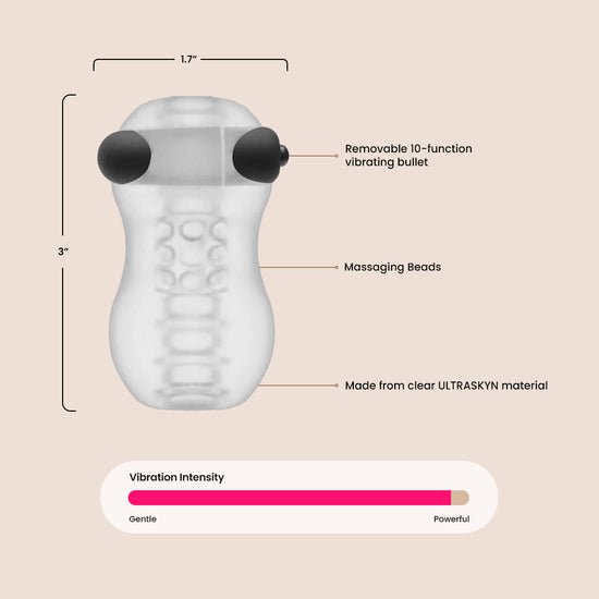 Doc Johnson's new GoodHead Vibrating Helping Head Pro is a 3-inch mini stroker and bullet vibe specifically designed for handheld use to heighten the sensations and pleasure during fellatio. Soft on the outside, and with stimulating massage beads on the inside, this uniquely-shaped stretchy stroker is made from our clear ultra-realistic ULTRASKYN, and the vibrator fits right in to provide a more intense sensation. Turn GoodHead into great head tonight!