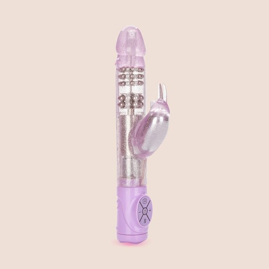 The glitter finish massager measures 4.75" x 1.5"/12cm x 3.75cm and is made from smooth and soft TPR, with easy push button ABS controls and an auto-off switch. The powerful stimulator has a thrusting shaft with a rounded tip and multiple rows of thrusting and rotating metal beads, and a curvaceous bunny teaser with flickering ears. Use the vibe to massage away tension and to stimulate sensitive, sweet spots all over the body.