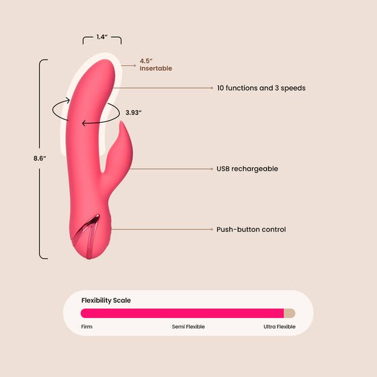 Whether you’re looking to turn up the heat with a lover or just enjoy some sensual solo time, this ravishing rabbit is ready. While the curved tip rocks back-and-forth for powerful g-spot massage, the soft, flickering clitoral vibrator delivers blissful external pleasure. Control and customize your pleasure play with the independently controlled vibration massager and rocking functions.