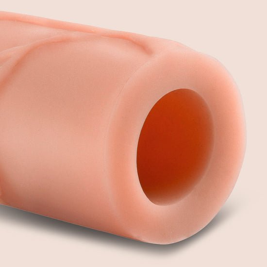 The Mega 3" Extension is a customizable extension that can be easily trimmed at the base for a perfect fit. It's super-stretchy to accommodate most sizes and snug enough to help you last longer. Your partner will enjoy deeper penetration with the 3" extension at the tip, while the ultra-lifelike shaft makes you 66% thicker all around. The soft Fanta Flesh material feels just like a second skin, giving you the length, girth, and confidence you need to satisfy your lover.